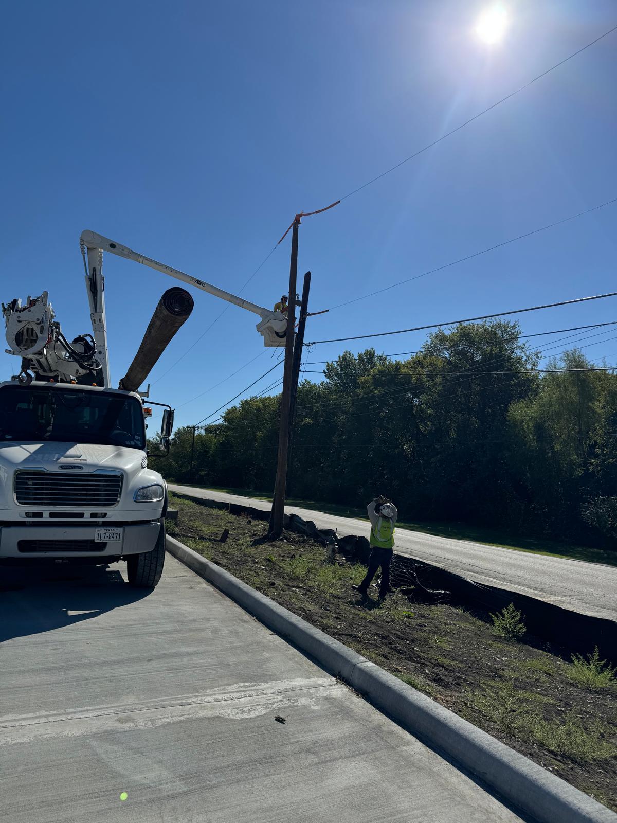 Completed three-phase electric connection with two new poles, including the transformer pad.